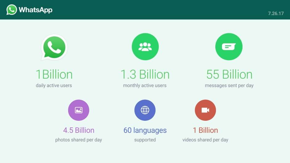 Prema upravo objavljenim podacima na WhatsApp Facebook strani, ova aplikacija ima 1.3 milijarde mesečno aktivnih korisnika i preko milijardu korisnika na dnevnom nivou. Ovi korisnici pošalju preko 55 milijardi poruka svakog dana i razmene više od 4.5 milijardi fotografija.