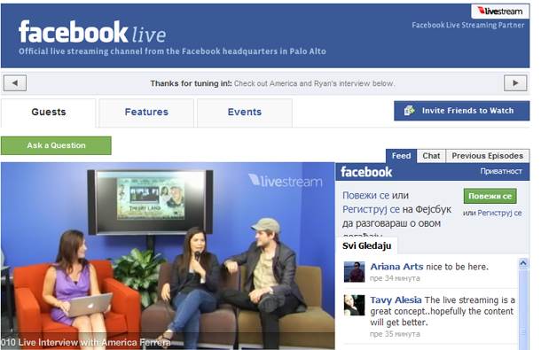 Prvi intervju koji je Facebook Live emitovao bio je sa glumicom Amerikom Fererom koja je na taj način promovisala svoj novi film "The Dry Land" .