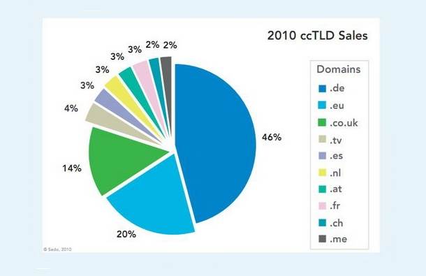 Prema objavljenom izveštaju, na prvom mestu se i dalje nalazi nemački nacionalni domen .de, sa tržišnim udelom od 46 odsto, na drugom mestu je .eu sa 20 odsto, a treće mesto zauzima domen .co.uk s učešćem od 14 odsto.