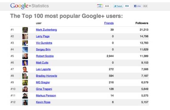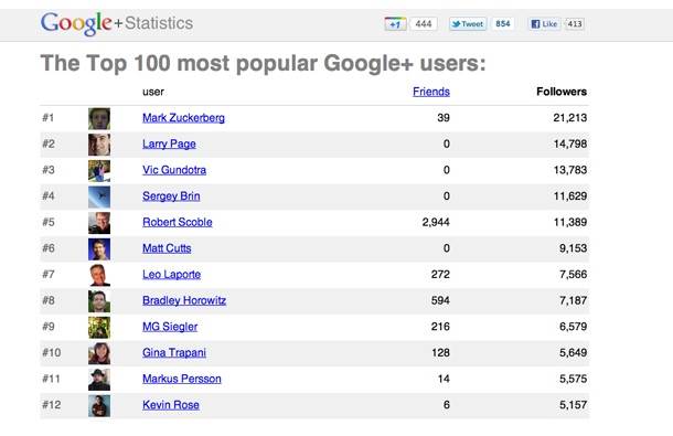 Tvorac Facebooka ima 21.213 followera, izvršni direktor kompanije Google Lari Pejdž 14.798, na trećem mestu je Vik Gundotra, "mag društvenih mreža" kompanije Google, a na četvrtom suosnivač kompanije, Sergej Brin.