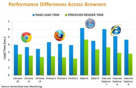 Među najsporijima u potpunom učitavanju veb stranica su Safari 4 i Internet Explorer 7, sa prosečnim vremenom punjenja prvi od 6,149 sekundi i drugi od 6,006 sekundi. Chrome 12 je najbrži sa, u proseku, 3,433 sekunde, a za njim sledi Firefox 5.