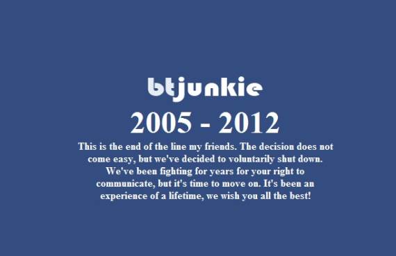 BTJunkie je u noći između ponedeljka i utorka prestao da radi a na tom domenu sada stoji oproštajna poruka osnivača.