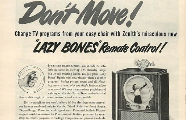 Od pojave prvih televizora, ulogu daljinskog upravljača obično je imao najmlađi član porodice, pa se često mogla čuti rečenica: „Sine, ’aj skoči do televizora i promeni program.“ Spas za lenje očeve stigao je 1950. godine, kada je napravljen prvi daljinski upravljač koji je dobio i adekvatno ime Lazy Bone („Lenje kosti“).