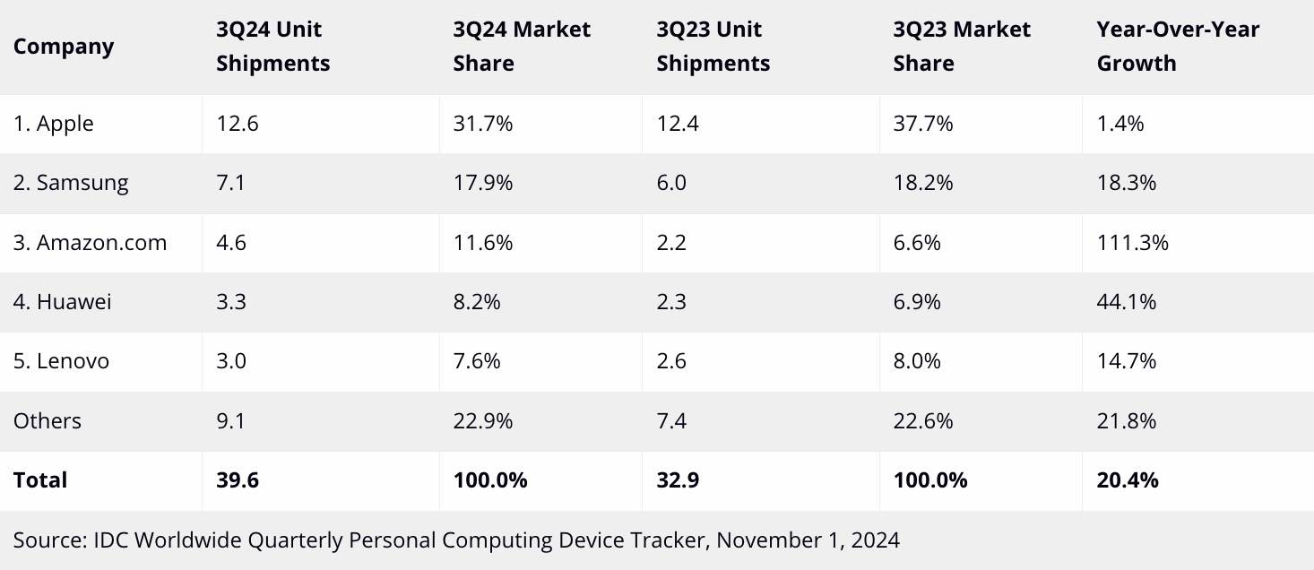 Lenovo je na petom mestu sa 3 miliona isporučenih jedinica, dok su sve druge kompanije isporučile 9,1 milion tableta u julu, avgustu i septembru 2024, za 1,7 miliona, odnosno 21,8 odsto više.