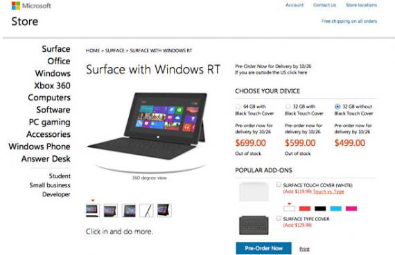 Prva verzija Surface tableta nema uobičajeni procesor i ne podržava standardni softver za personalne računare, ali ima verziju Office paketa. MS će svoj tablet najpre prodavati u Americi i Kanadi, a preko interneta u Australiji, Kini, Francuskoj, Nemačkoj, Hong Kongu i Velikoj Britaniji.