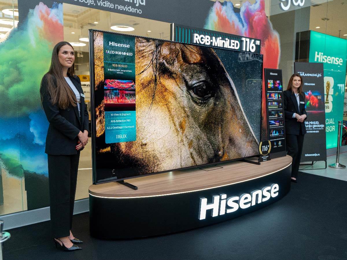 Među prvima u Evropi, kupcima u Srbiji je predstavljen najveći televizor koji novac trenutno može da kupi na našem tržištu - Hisense 116UXQ, dijagonale čak 116 inča - što je gotovo tri metra. Tehnološki gigant je svoj gorostasni ekran premijerno prikazao u Tehnomanija prodavnici u tržnom centru Galerija, gde je televizor već dostupan za kupovinu.