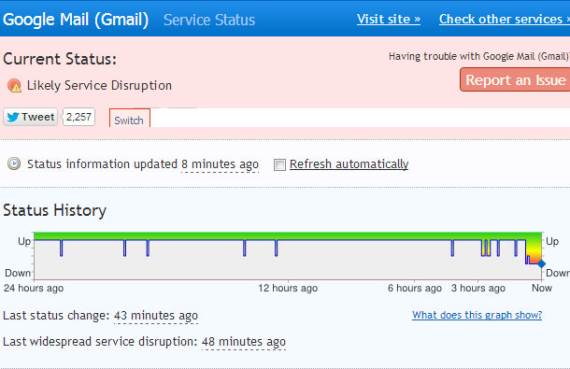 Servis downrightnow.com/gmail prijavio je da GMail trenutno ima ozbiljnih problema, koje su korisnici prijavljivali uglavnom na Twitter mreži i na pomenutom sajtu.