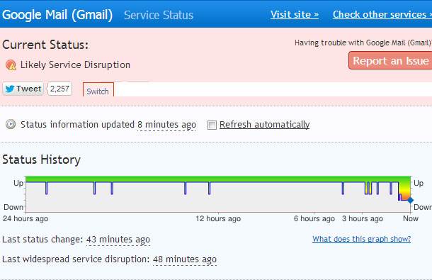 Baveći se merenjem dostupnosti sajtova i servisa, downrightnow.com je oko 18 sati prijavio da GMail ima problem sa radom. Njegov indeks je bio mnogo bliži opciji da ne radi, nego da radi (pogledajte sliku).