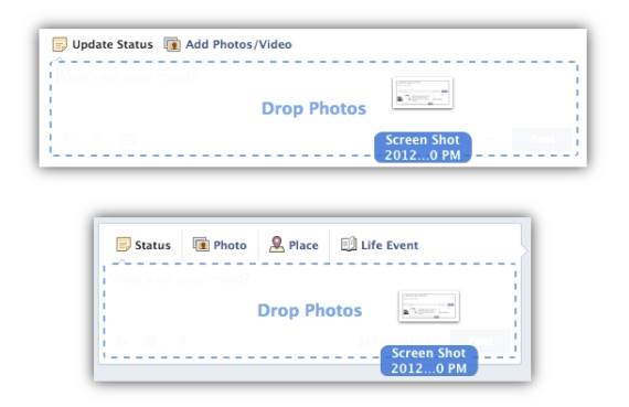 Drag and Drop opcija olakšava otpremanje fotki na Fejs, jer je dovoljno da mišem izaberete fotku bilo gde na svom računaru, klikete na nju i prevučete je do polja za status, komentar ili da je dodate u foto album.