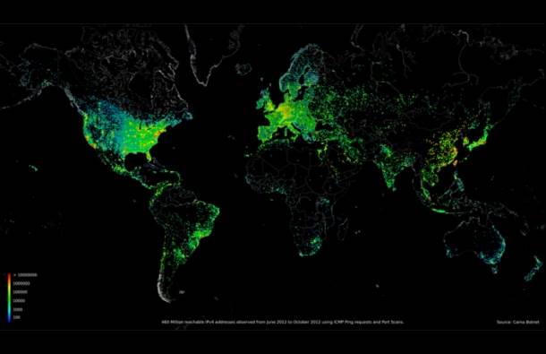 Gledate u sliku Internet mreže tokom jednog dana, krajem oktobra 2012. godine, na kojoj žute i crvene tačkice predstavljaju visok stepen korišćenja, dok plave i zelene prikazuju niži stepen upotrebe tokom 24 sata. Neprekriveni deo karte predstavlja delove gde internet tokom posmatranog perioda nije registrovan.