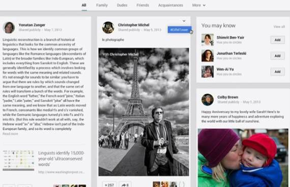 Interfejs aplikacije Google+ sa Android uređaja pretočena je i u web interfejs, koji ga je ulepšao i dao mu na dinamičnosti. Nove objave i deljeni sadržaji pojavljuju se odmah na vrhu ekrana, tako da korisnik ima pregled svih dešavanja, koji zbog tri kolone sadržaja može jednostavno, a brzo da prati.