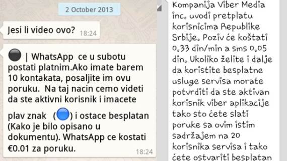 "WhatsApp će u subotu postati platnim. Ako imate barem 10 kontakata, pošaljite im ovu poruku. Na taj način ćemo videti da ste aktivni korisnik, imaćete plav znak i ostaće besplatan (kako je bilo opisano u dokumentu). WhatsApp će koštati 0,01 evro za poruku".