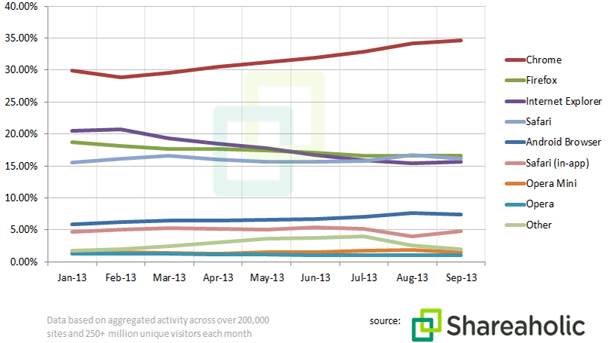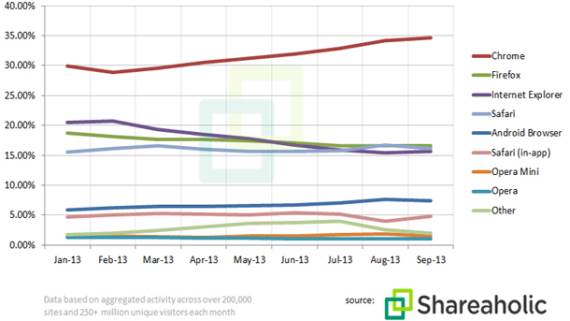 Chrome u ovom trenutku koristi skoro 35 odsto korisnika, dok Firefox ima oko 17 odsto, Internet Explorer 16, a Opera nešto sitno preko jednog odsto svih korisnika interneta.