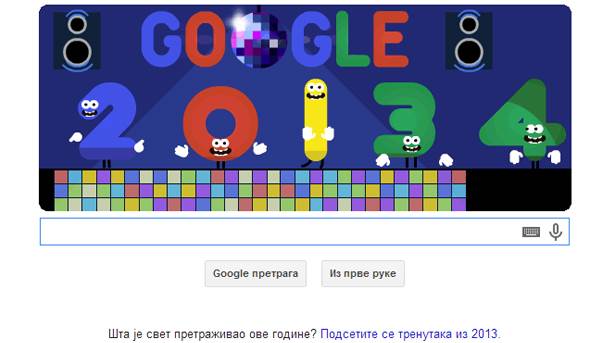 Disko kugla, đuska, nasmejana lica i smena trojke i četvorke. Otprilike tako izgleda poslednji ovogodišnji Google Doodle koji prikazuje smenu 2013. i 2014. godine. Šta će se desiti u ponoć, da li nas očekuje novi Doodle - videćemo - a do tada pogledajte kako je i šta svet tražio na najvećem internet pretraživaču tokom godine na izmaku.