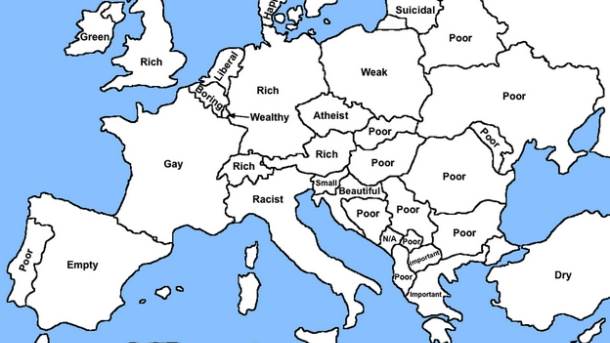 Na zapadu Evrope je nešto šarenije pa je tako Francuska "gej", Nemačka i Velika Britanije "bogate", Italija "rasistička", a Skandinavske zemlje "srećne" ili "inteligentne".