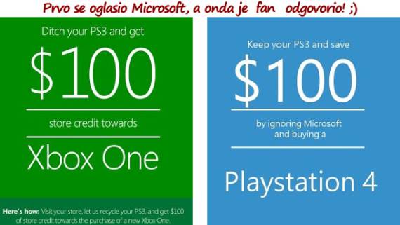 Microsoft je korisnicima u novoj markentiškoj kampanji poslao mejl u kojem ih je pozvao da u Xbox prodavnicu donesu PS3 konzolu na reciklažu, u zamenu za 100 dolara popusta za kupovinu konzole Xbox One.