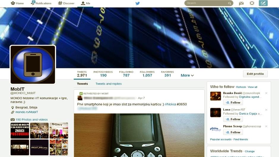 Fotografije i objavljena multimedija ostali su na levom delu strane, uz detaljne informacije o vlasniku profila, dok su sa desne "trending" sadržaji i preporuke koga bismo mogli da pratimo na osnovu našeg profila i tvitova. Takođe, iznad "lajne" - prostora u kojem se objavljuju tvitovi, kako ga popularno zovu tviteraši - nalaze se brojke: Koliko ljudi pratimo, koliko nas prati, koliko smo puta lupili zvezdicu, koliko multimedijalnih datoteka smo objavili, koliko tvitova je objavljeno i druge, koje se mogu dobiti klikom na "More".