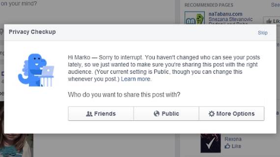 Što se starih korisnika tiče, Facebook je rešio da i njih edukuje o najčešće korišćenim opcijama privatnosti. Recimo, kada počnete da kucate status ili ubacujete fotku i druge sadržaje na Fejs, društvena mreža će vas podsetiti da podesite vidljivost objave (pogledajte sliku gore). Prikazaće vam sadašnja podešavanja privatnosti i ko može da vidi poruku ili sadržaj koji objavljujete na News Feedu i ponuditi vam da te parametre promenite odmah iz tog "pop-up" prozora.