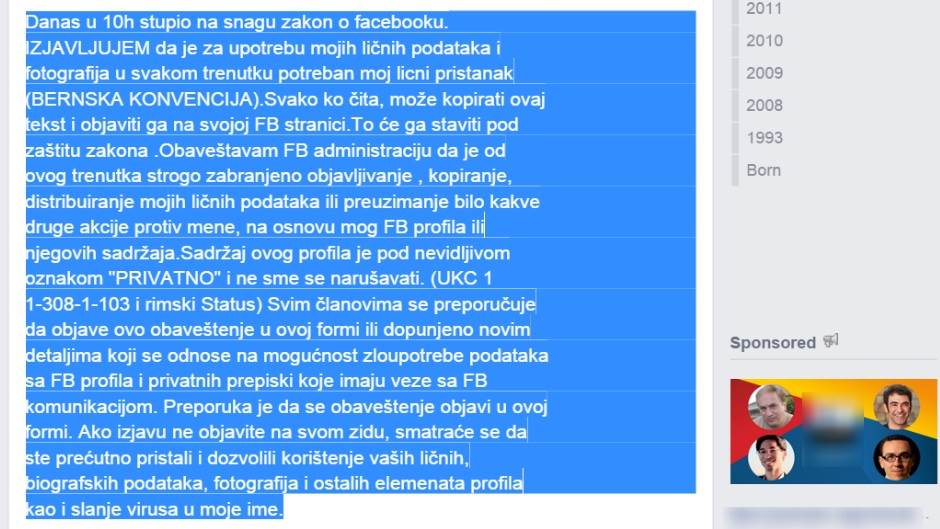 Facebook je najavio da će od 2015. godine, već od 1. januara, na snagu stupiti novi Pravilnik o privatnosti i objavi sadržaja na toj društvenoj mreži, nakon čega se pojavila poruka iz odeljka koji vidite ispod. Poruka se brzo raširila po News Feedu korisnika i mnogi je još uvek kače, misleći da su se "zaštitili" od deljenja njihovih podataka od strane Facebooka. Moramo vas razočarati i reći vam da ta poruka ne radi, ama baš ništa, osim što "čuči" na vašem News Feedu.