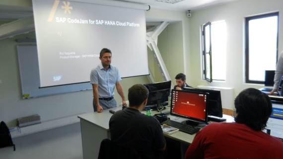 Studentima se prvo obratio Jaka Črnivec, University Alliances menadžer zadužen za region Jugoistočne Evrope u kompaniji SAP, koji je rekao: ”SAP University Alliance je program koji je pokrenut u Nemačkoj 1988. godine i okuplja univerzitete šitom sveta. U program je do sada bilo uključeno više od 4 miliona studenata na više od 2.000 univerziteta i škola širom sveta. Osnovna ideja ovog projekta je da se studentima pruži mogućnost prakse na SAP-ovim programima u toku studiranja i time poveća stopa zaposlenosti svršenih studenata, pri čemu se univerziteti i škole vide kao mesta gde se nalaze neophodni talenti. SAP University Alliance program poboljšava kvalitet radne snage još u periodu studiranja, fokusira se na biznis procese i pokriva različite discipline i na taj način samo pojačava nastavne programe sa praktičnog poslovnog aspekta. Kroz programe i događaje koje organizujemo, želimo da ohrabrimo studente da razmišljaju na inovativan način kako bi probleme na koje nailaze mogli da reše koristeći najnovoije IT tehnologije kakva je i SAP HANA“.