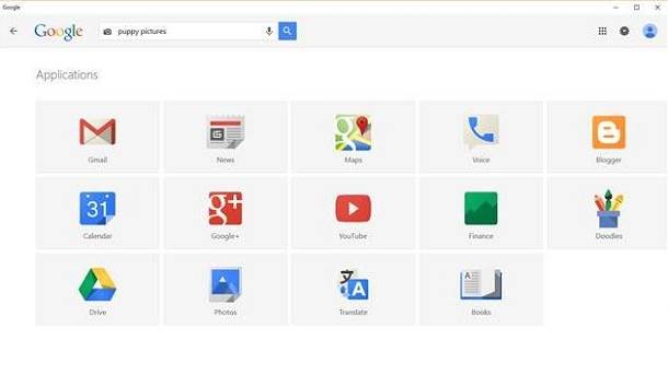 Google Search aplikacija dozvoljava Windows 10 korisnicima pristup Googleovom search engine-u bez korišćenja pregledača. Mikrofon je podržan pa će korisnici moći da izgovore ono što žele da pretraže. Aplikacija takođe podržava pretragu fotografija. Dostupna je i strana sa online verzijama Google aplikacija i servisa kao što su YouTube, Gmail, Mape, itd.